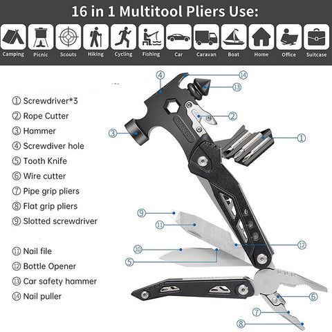 The 14 in 1 multi tools survival tools set includes a Magnetic Bit Hanging Hole, hammer, Saw, Can opener, Large and small hexagon wrenches, Corkscrew, Clamp, Strong pliers, Cutting pliers, Screwdriver head, Nail puller, Wire cutting pliers, Corkscrew, Can opener and more. All little power tools not only could be folded easily, but also be a great gift for dad, Handyman, Men, or Women on Father's Day, Birthdays, Christmas, and Thanksgiving day.