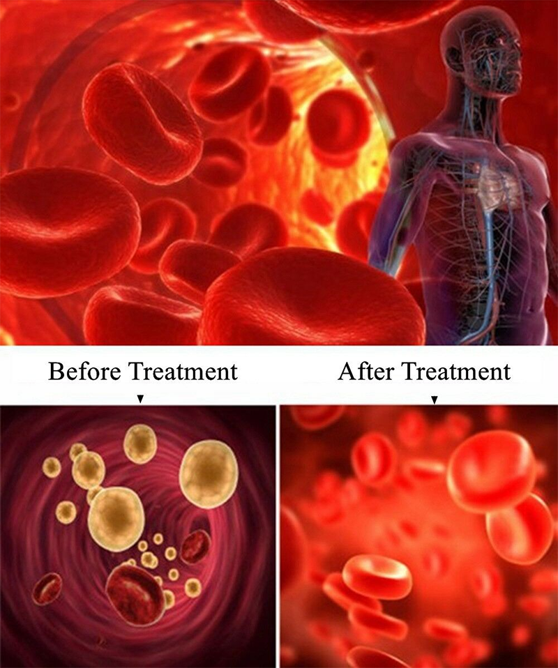It helps to enhance the deformability and improve the aggregation of red cells and blood platelets when light quantum penetrates blood, thus separating the gathered red cells, decreasing the blood viscosity, enhancing the oxygen-carrying capacity, and accelerating the entire body's blood circulation.