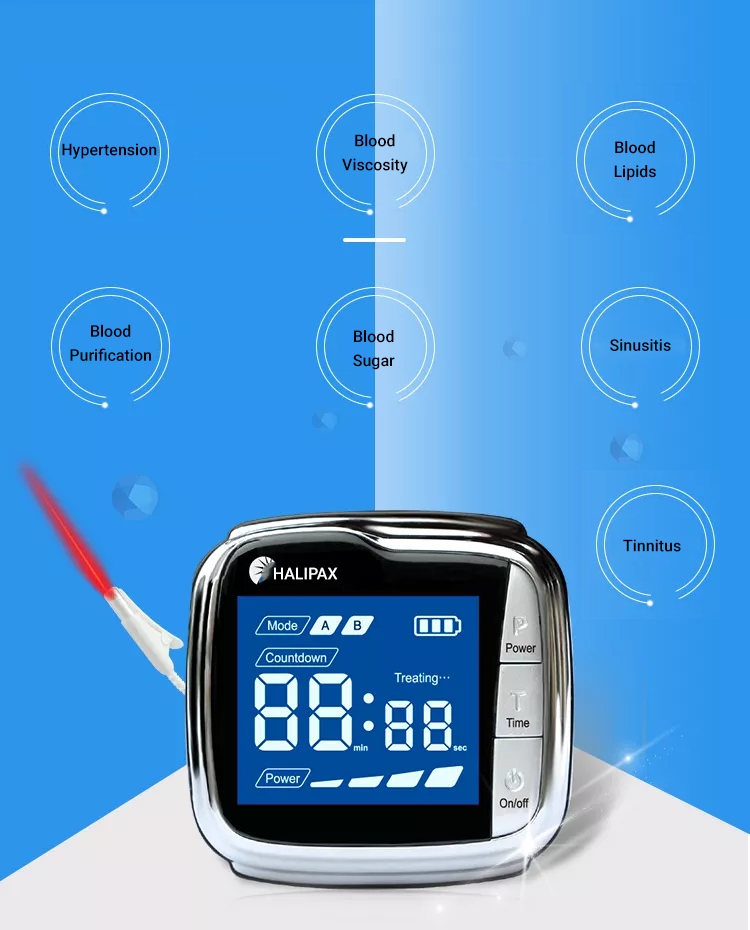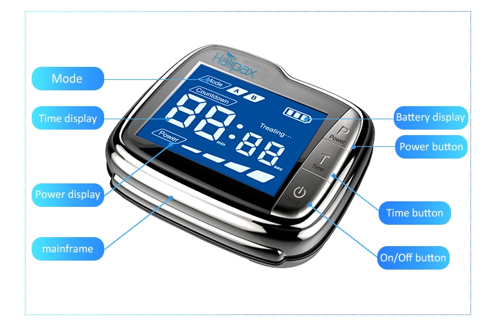 The Halipax™ LLLT Watch is slightly larger than a wristwatch and is applied to the wrist, facilitating simultaneous and continuous acupuncture points or blood irradiation through laser light.