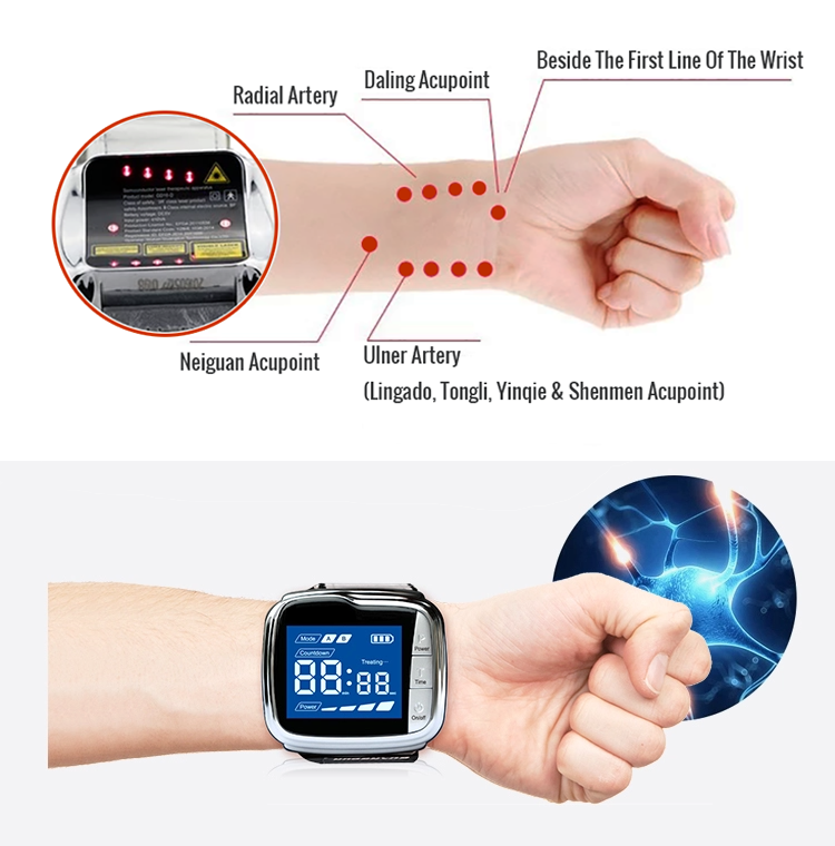 Cold Laser Therapy Watch, utilizes the ideal wavelength of 650nm from the low-intensity laser. This wavelength is specifically designed for safe, pain-free, and effective treatment of high blood pressure and other circulatory issues for just 30 minutes per day for 2 weeks.