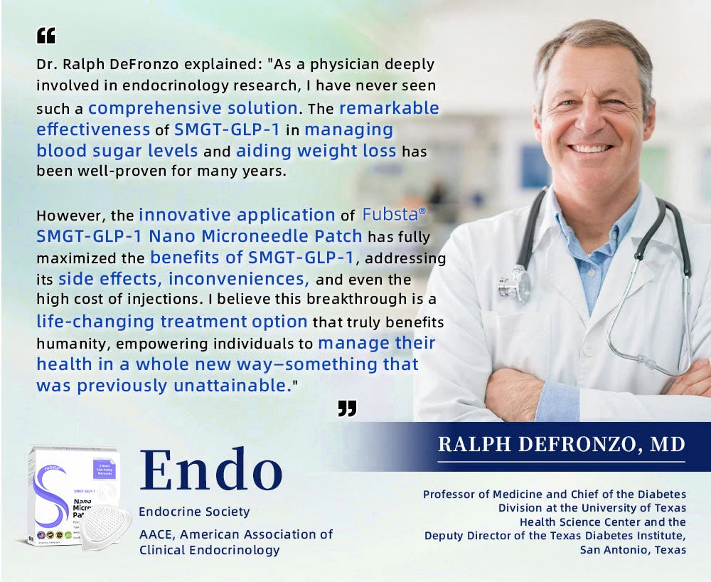 "I suffer from both obesity and diabetes. and I've been getting SMGT-GLP-1 treatment at the hospital. You might be wondering why I suddenly switched to using the Fubsta® Microneedle PatchSMGT-GLP-1. also known as semaglutide. is definitely a great treatment. It works really fast—just a short time after injection. my appetite dropped. I lost weight quickly. and my blood sugar went down. But. as we all know. it's tough to break old habits. On my scheduled injection days. I'd come up with all sorts of excuses to skip. which led to failed treatments. The costhungertime conflicts. or even something as simple as it raining outside would keep me from going. But the Microneedle Patch is perfect for someone like me who struggles with inertia. I can use it easily at home. and the effects last. keeping my appetite in check. What's even better is that it's really affordable. and anyone can use SMGT-GLP-1 to help lose weight and keep their blood sugar in check!"
