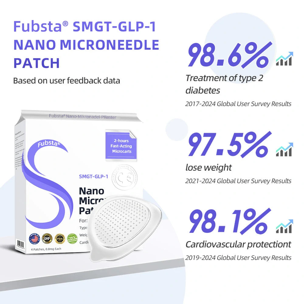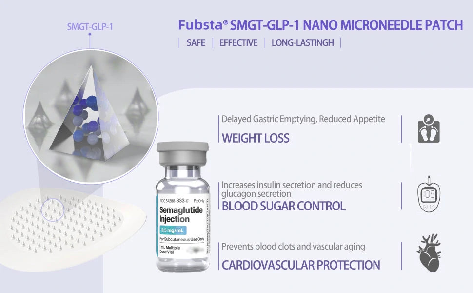 The Fubsta® SMGT-GLP-1 Nano Microneedle Patch offers a long-lasting. slow release of the medication. ensuring a stable effect over 24 hours without causing any discomfort. With the same dosage and price. it can maintain up to 20 times longer-lasting effects (similar to the difference between an IV drip and a single injection).