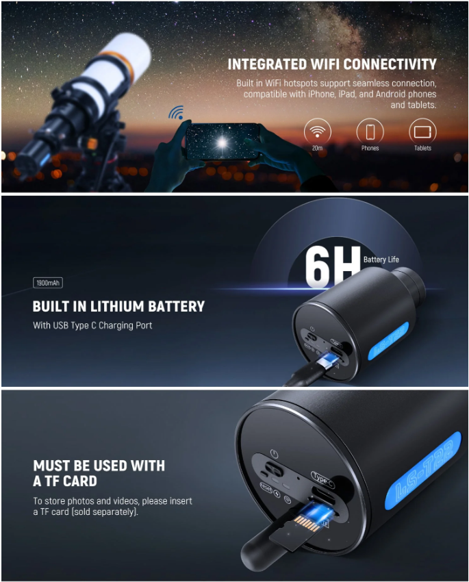 • Integrated WiFi Connectivity- This 1.25" WiFi electronic eyepiece connects to your phone via the integrated WiFi hotspot for astrophotography and birdwatching. The telescope eyepiece allows you to observe and zoom subjects in real time for unparalleled efficiency and comfort. Note: The phone is unable to access the internet when connected to the eyepiece's WiFi hotspot. Please disconnect from it and connect to other networks for internet access