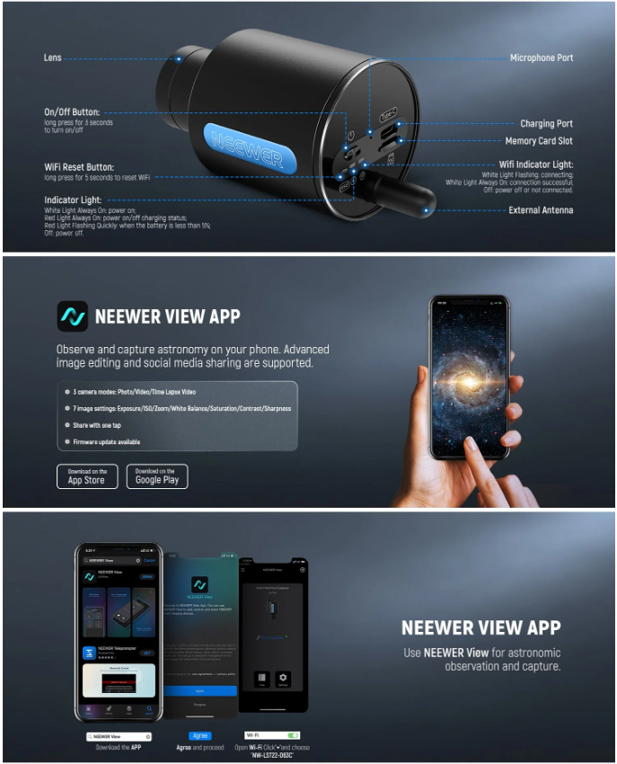 • Use with NEEWER View App- The NEEWER View app allows you to observe astronomy and take photos and videos all on your phone. The astrophotography eyepiece allows social media sharing and advanced image settings, such as exposure (EV), ISO, Zoom (1-5X), white balance, saturation, sharpness, and contrast