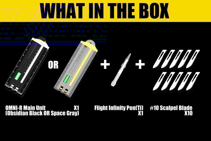 Each set includes an OMNI-R main unit, one Flight Infinity pen, and 10 #10 replaceable surgical blades.
