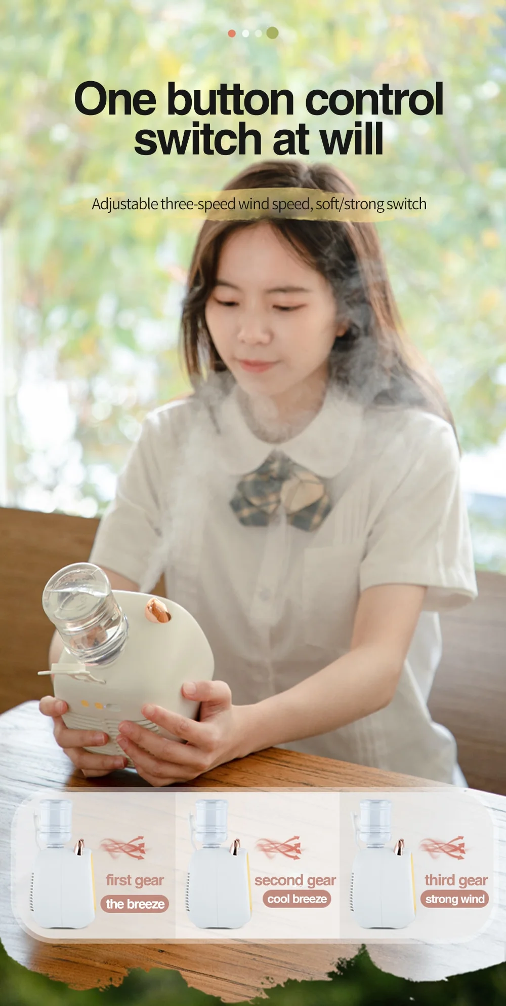 【3-speed fan speed and fine mist sprayer】Personal air cooler has 3-speed fan speed mode (low/medium/high). It will provide comfort, coolness, natural wind according to your needs. Using ultrasonic atomization technology, this mini air conditioner can provide your skin with a refreshing cooling spray and moisture. (Not suitable for large room or zone cooling)