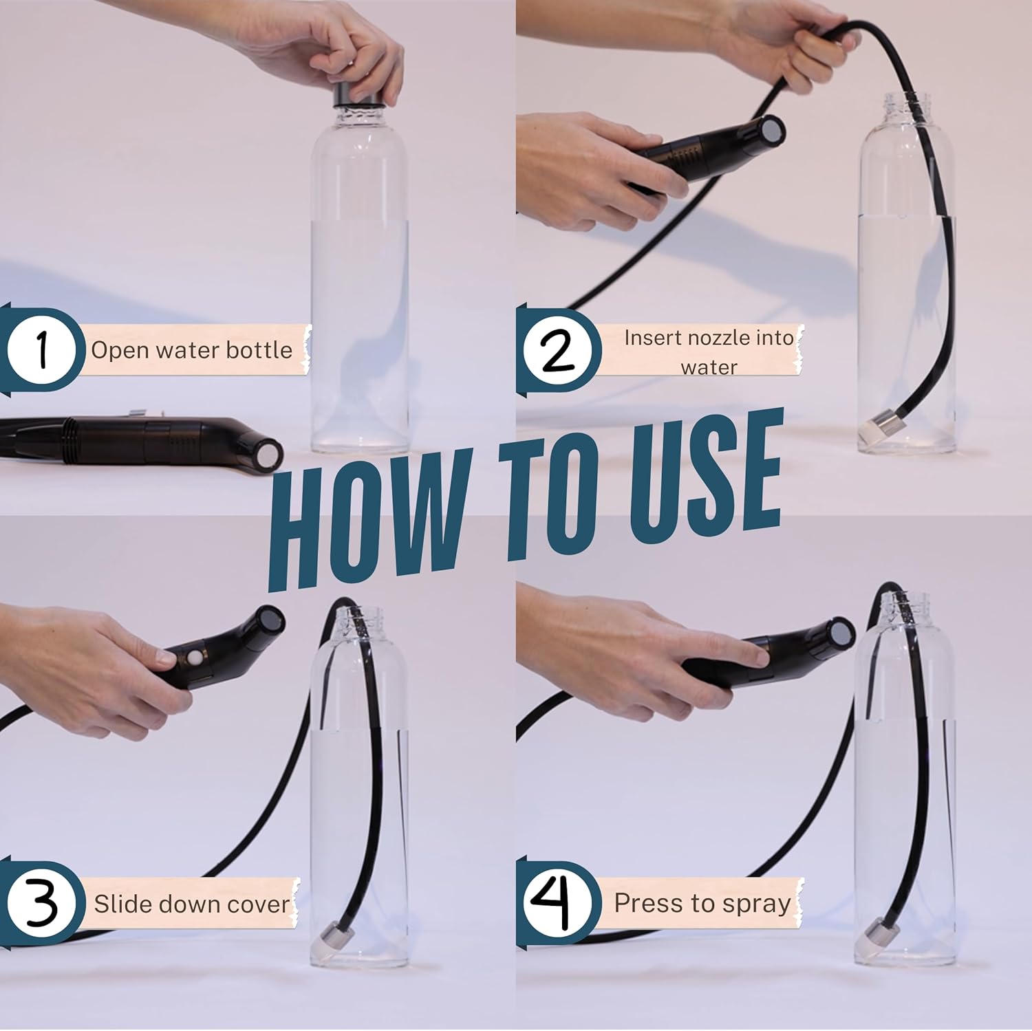 Compatible with any water bottle: Dip the pipe into any bottle of water and turn on to spray