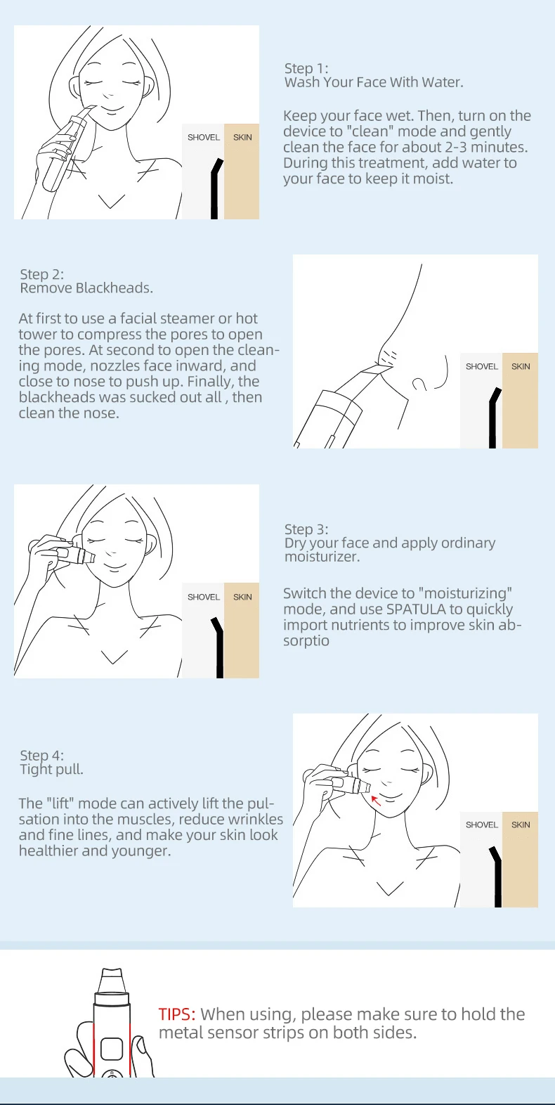Vier huidverzorgingsmodi: Peel + lifting + Ion +,Ion-reinigt effectief poriën, verwijdert huidvuil en overtollige olie, verstevigt en tilt de huid, vermindert fijne lijntjes en helpt de huid voedingsstoffen op te nemen.